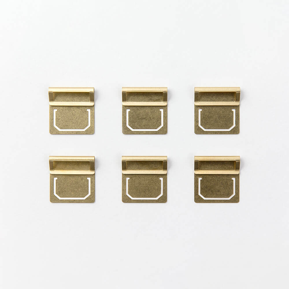 A brass clip designed to hold a small piece of paper where you can write a title, date, or note. Use it as an index for notebooks and files, or attach it to envelopes and folders to organize cards and documents.