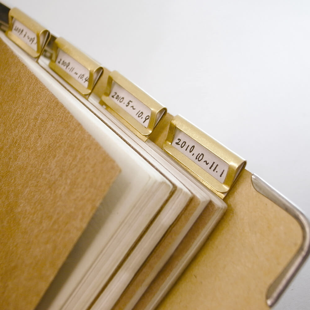 The frame itself functions as a clip, allowing it to serve as a label holder when placed on a notebook cover. Over time, the brass develops a rich patina, turning this simple tool into something quietly personal and timeless.