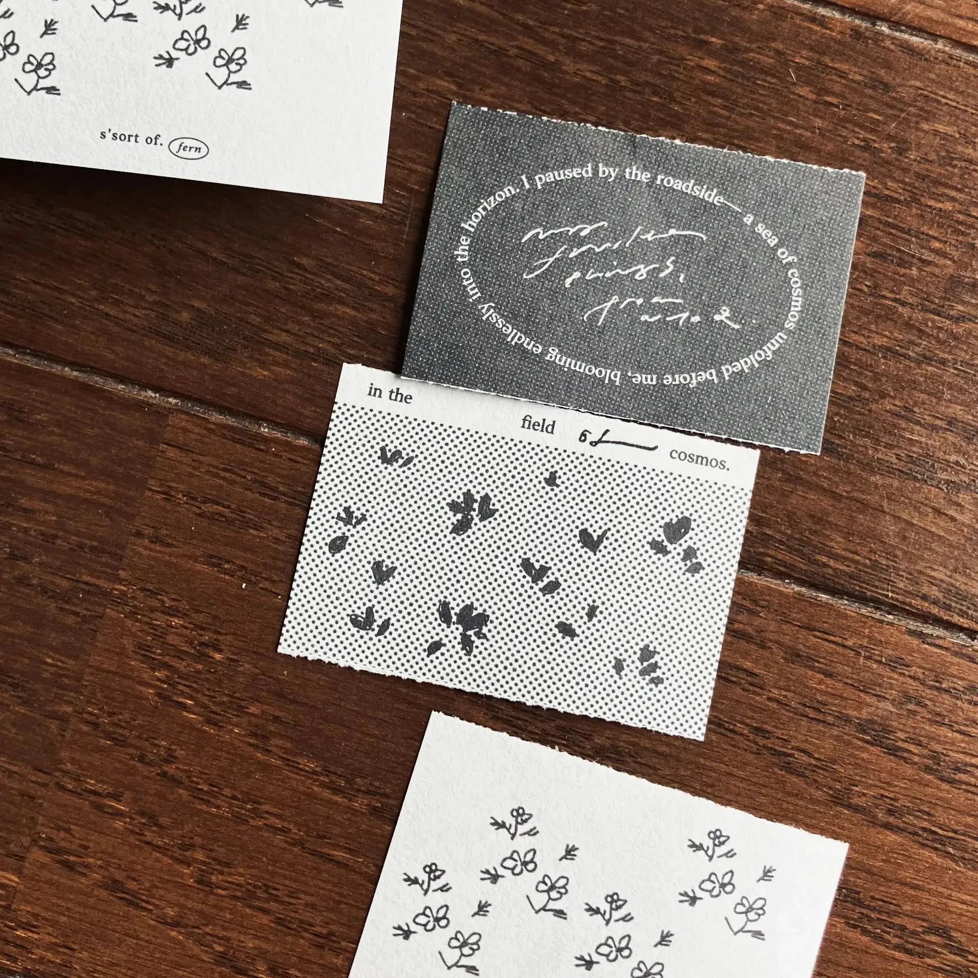 A vast field of cosmos flowers, petals scattered by the wind, gently landing on paper. Like a sun-exposed film, even black and white have their own warmth.