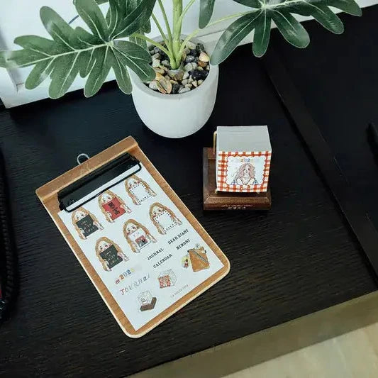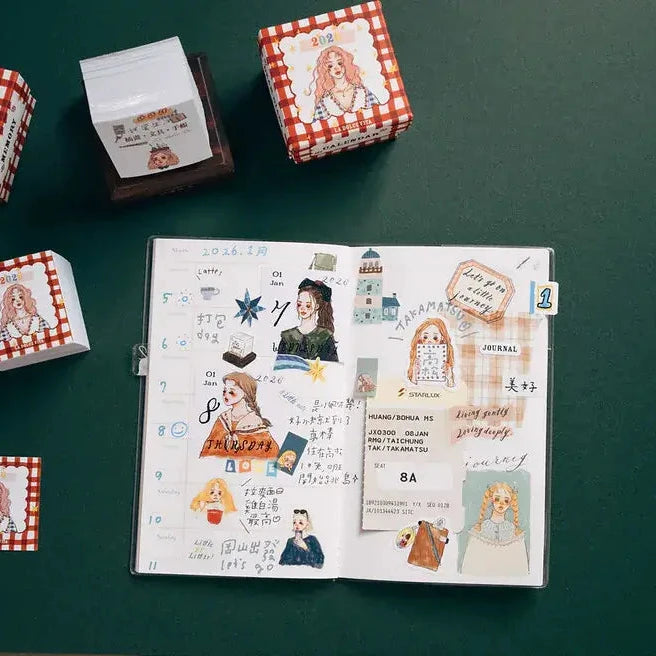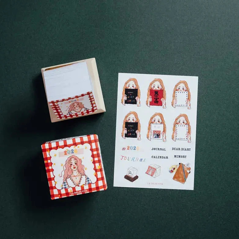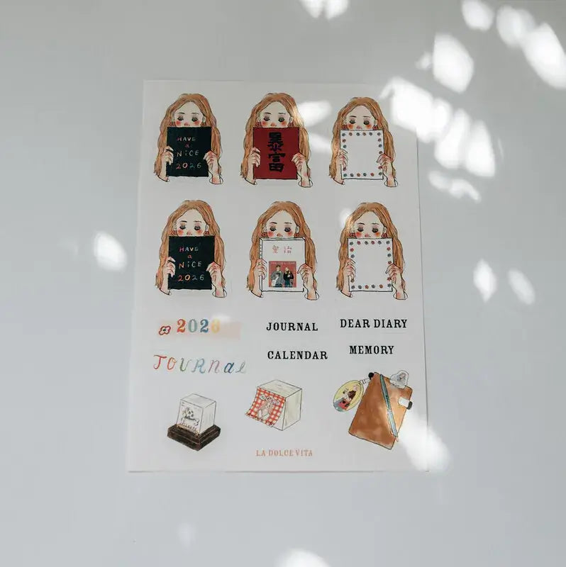 This washi sticker sheet features La Dolce Vita’s signature girl illustrations, each holding a different kind of record: a journal, a diary, a calendar, or a memory yet to be written. Small everyday objects are scattered throughout, echoing the quiet rituals of documenting life as it passes.