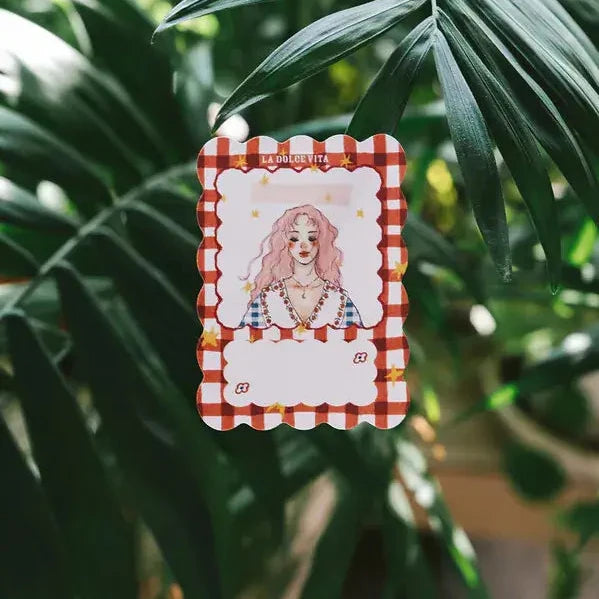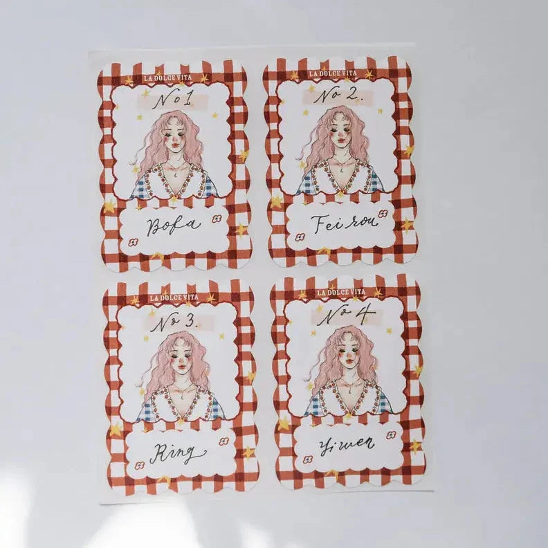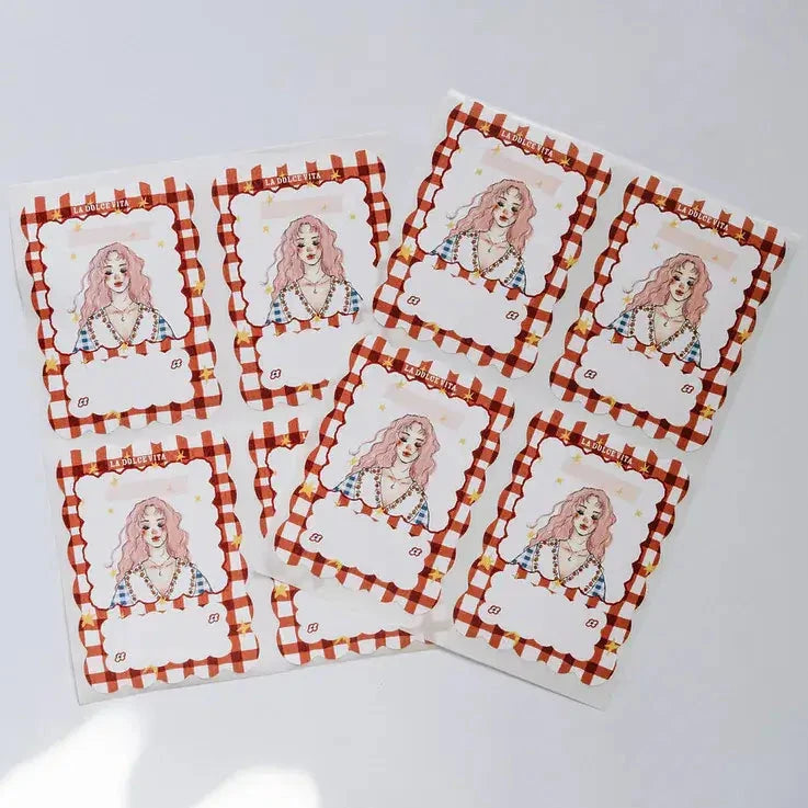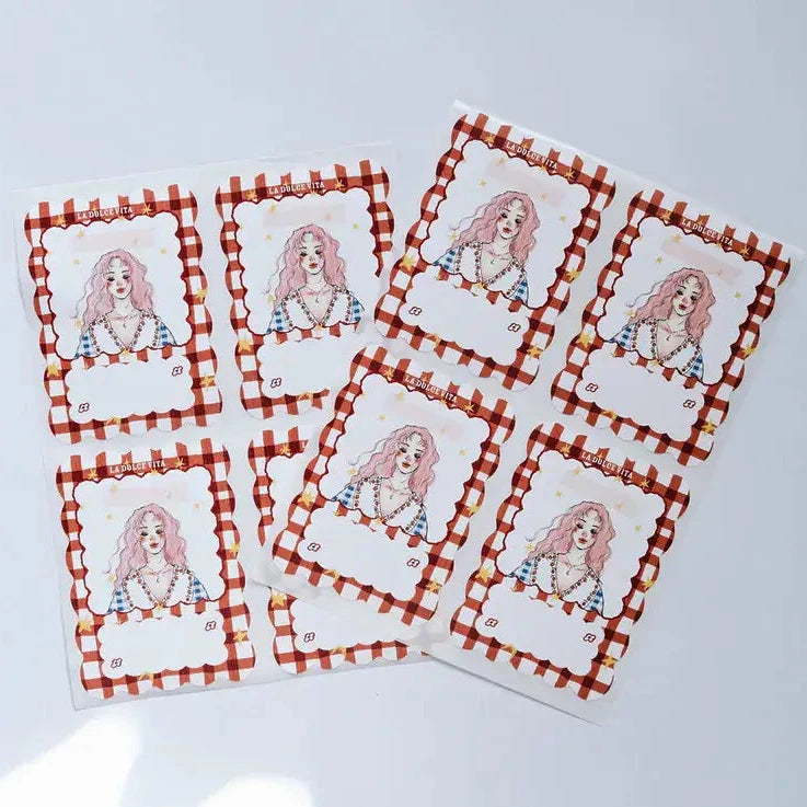 This label sticker set features La Dolce Vita’s signature girl illustration, framed in a warm red label design. Each piece includes a clean, writable space, perfect for dates, short notes, names, or small thoughts you want to keep close.