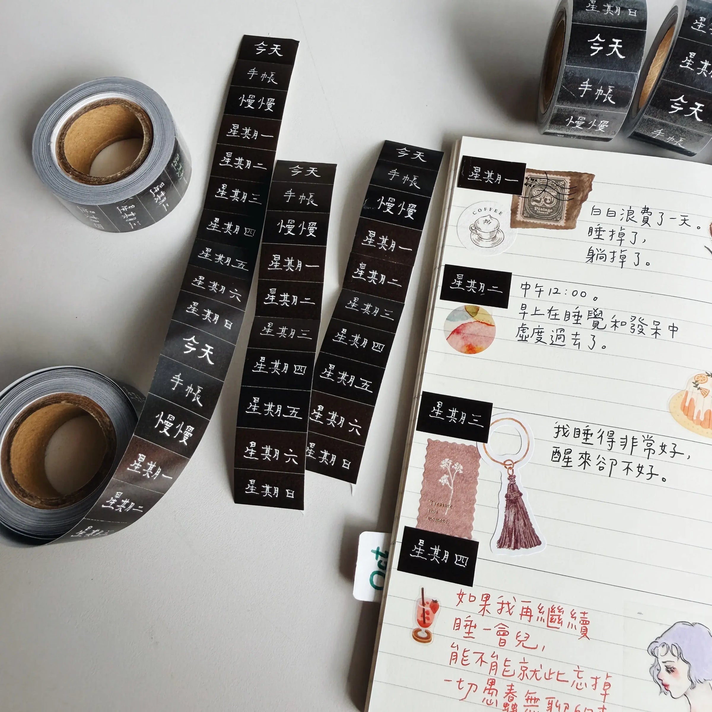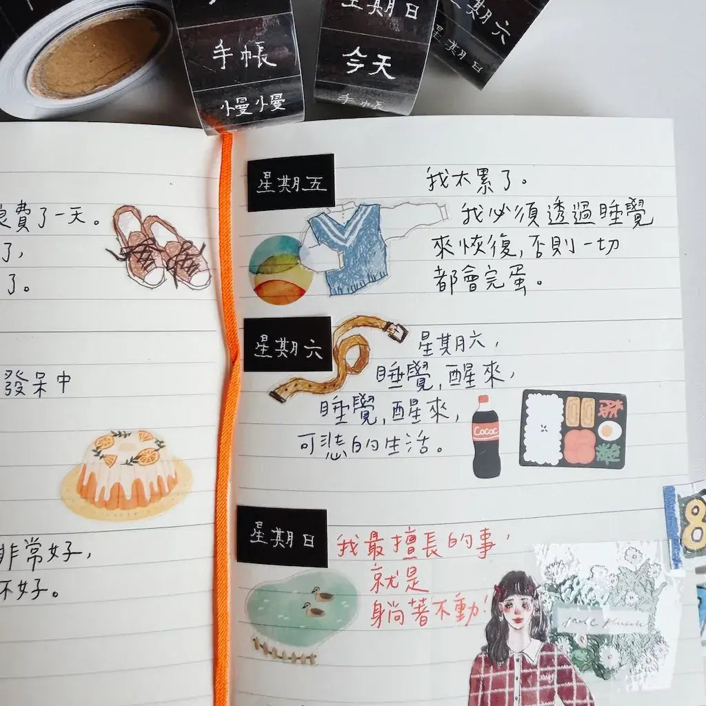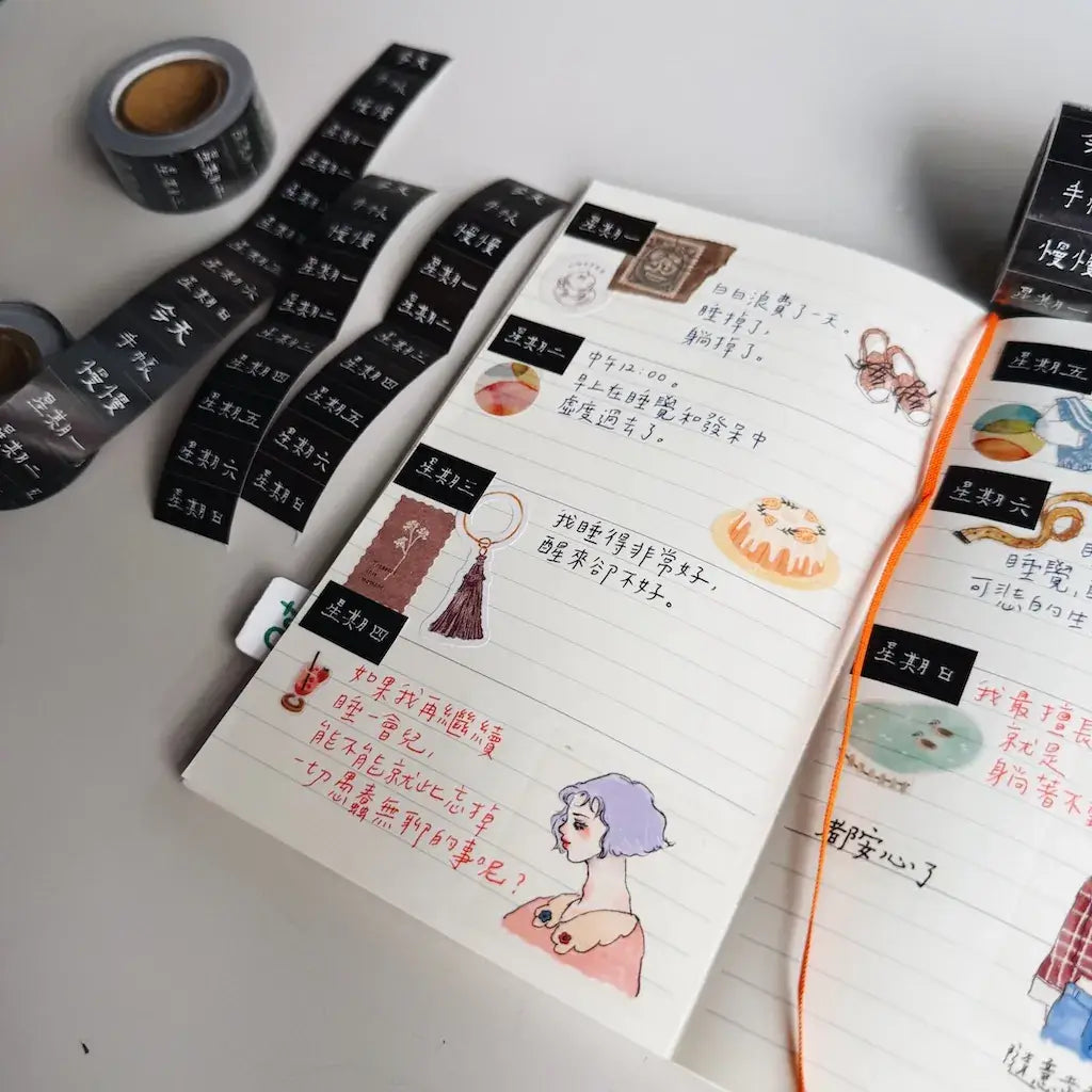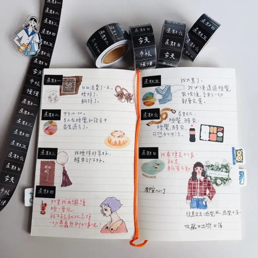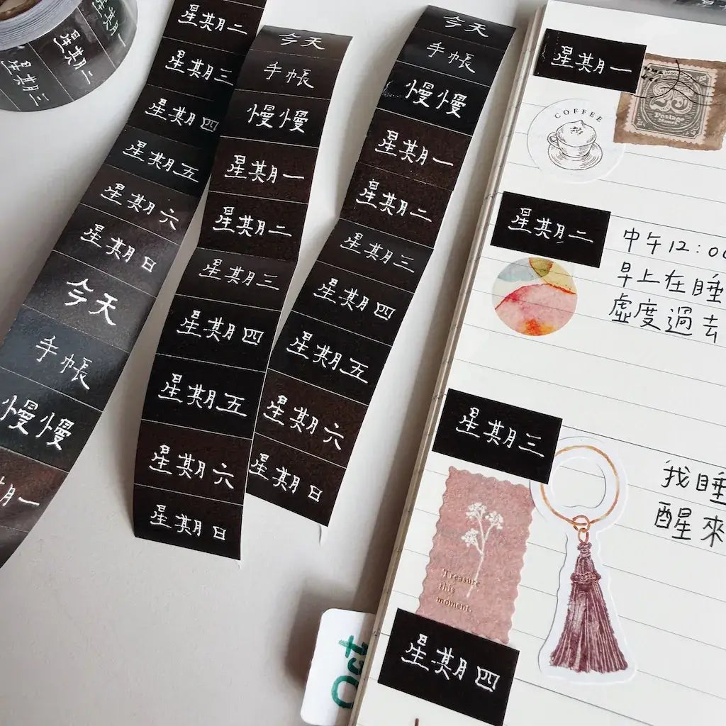 A strip of handwritten words featuring the days of the week. This label tape also features a collection of Chinese words, along with special labels like Today (今天), Slow (慢慢), and Journal (手帳). A useful label to keep track of your days or highlight special moments of daily living.
