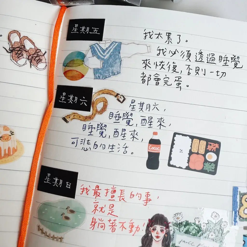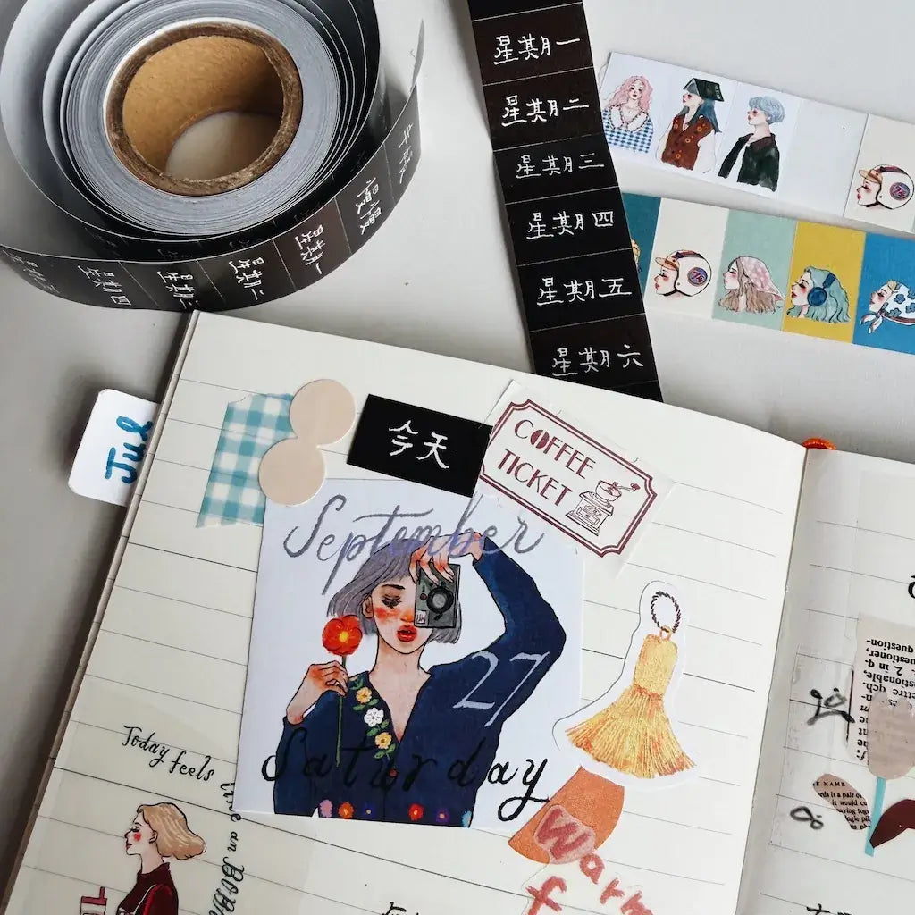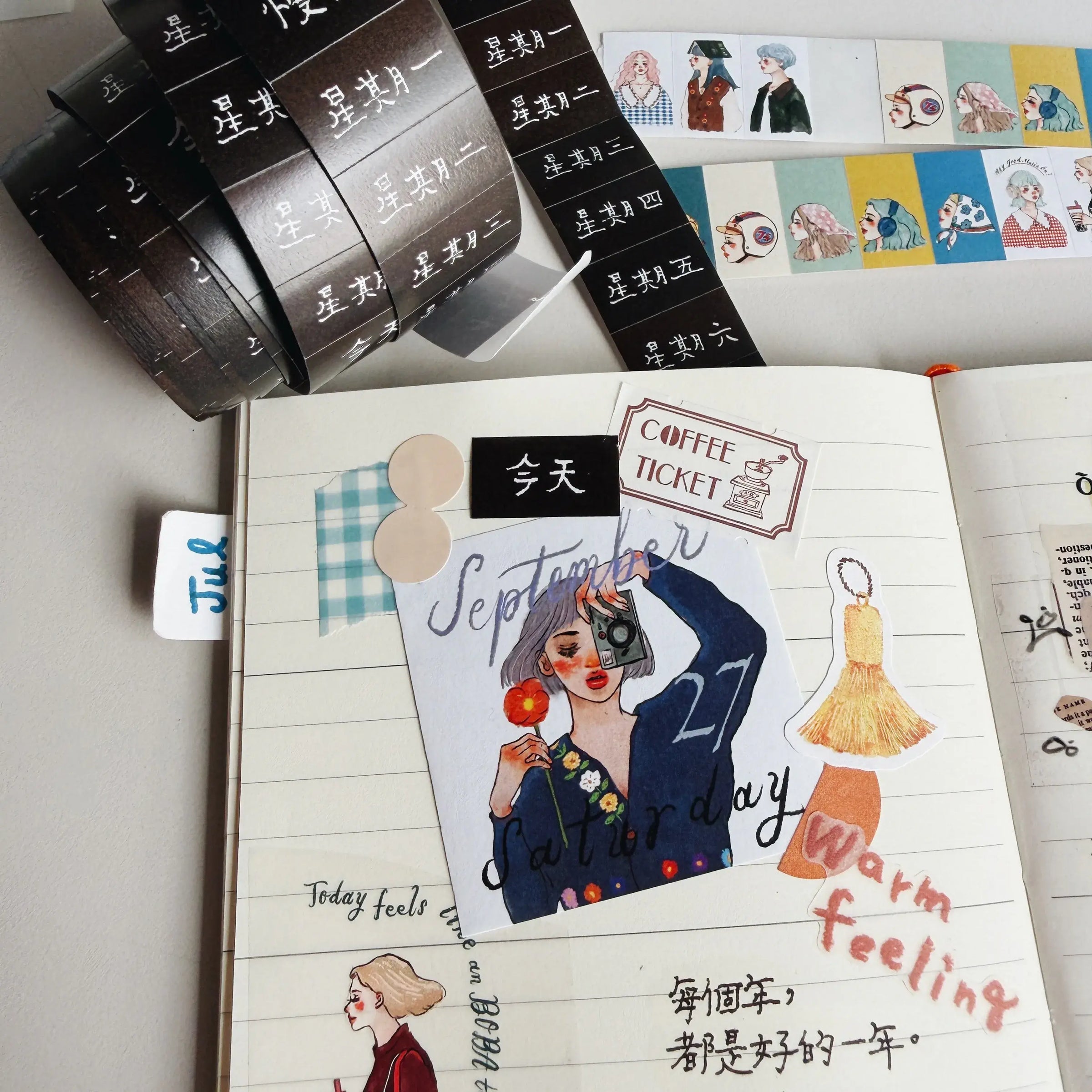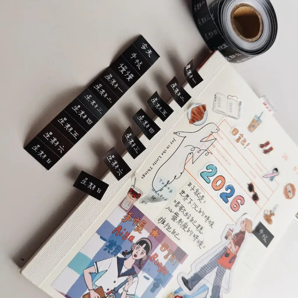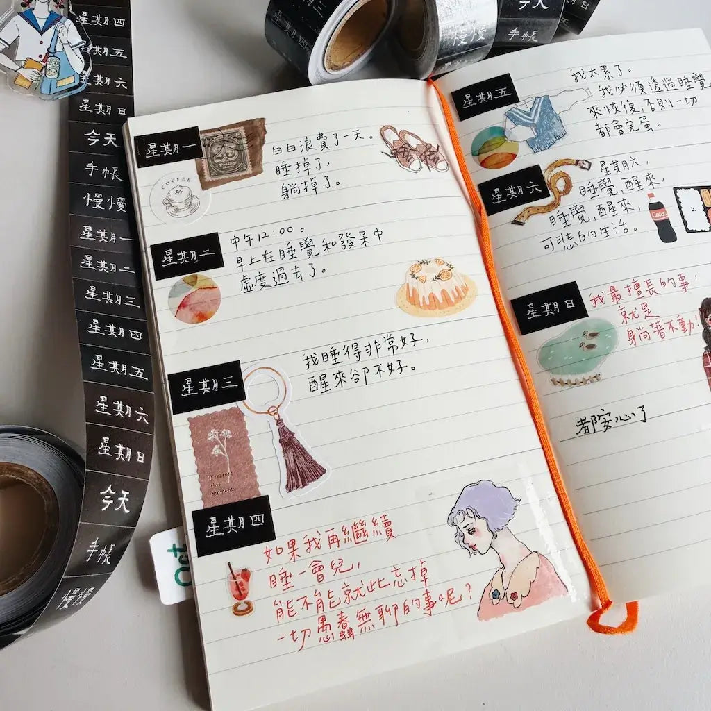 A strip of handwritten words featuring the days of the week. This label tape also features a collection of Chinese words, along with special labels like Today (今天), Slow (慢慢), and Journal (手帳). A useful label to keep track of your days or highlight special moments of daily living.