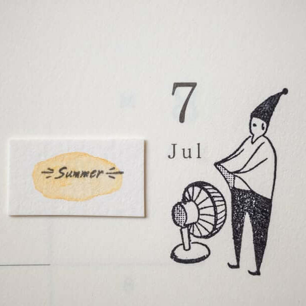 This rubber stamp features a little elf standing in front of a fan, doing their best to catch every bit of cool air. Paired with the phrase “Taking in cool air with all my might,” the design captures a familiar summer moment with gentle humour.