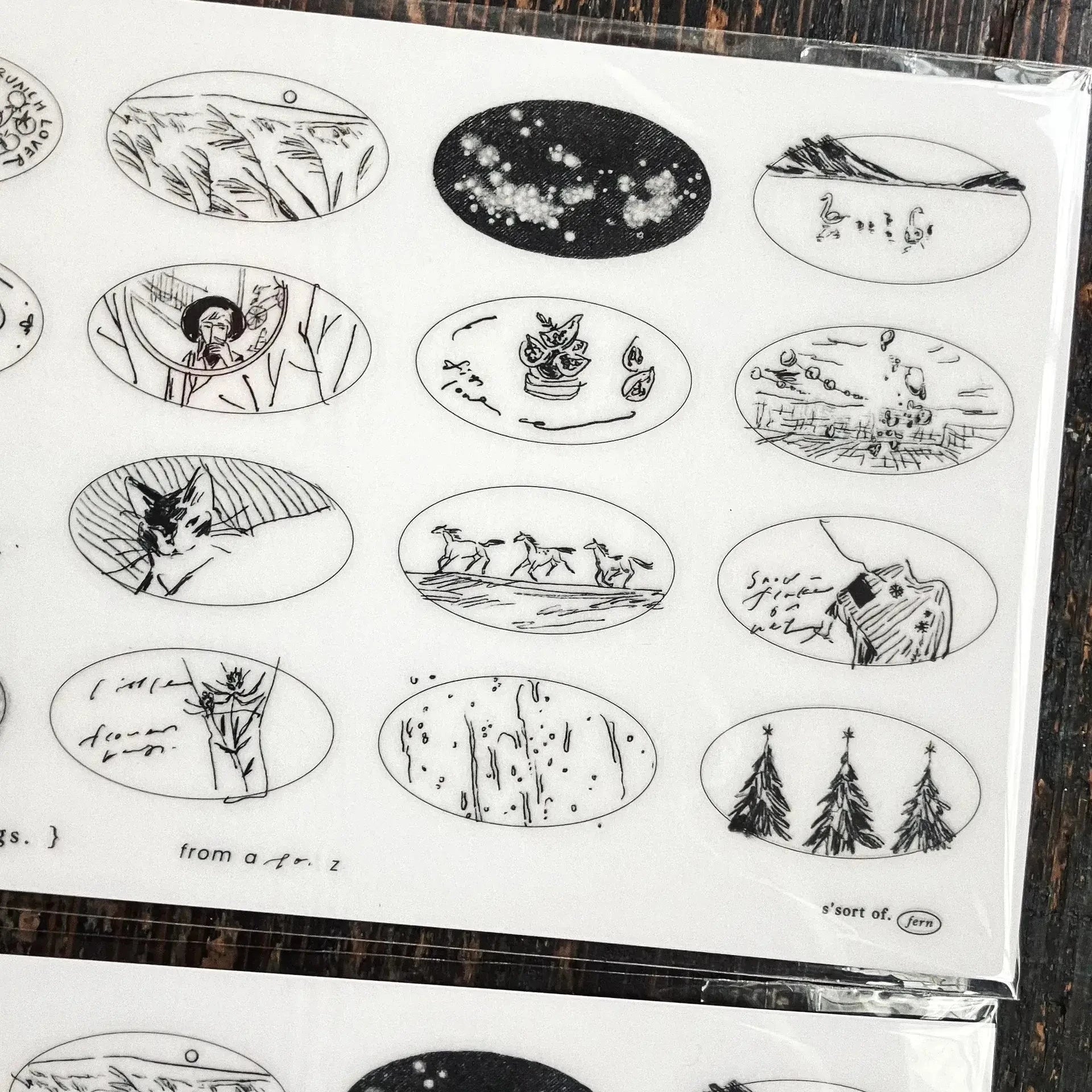 Each small oval drawing captures a fleeting scene — simple, expressive, and beautifully raw. With no white ink added, the pure linework blends seamlessly onto your paper, creating a soft, hand-drawn look that feels intimate and personal.