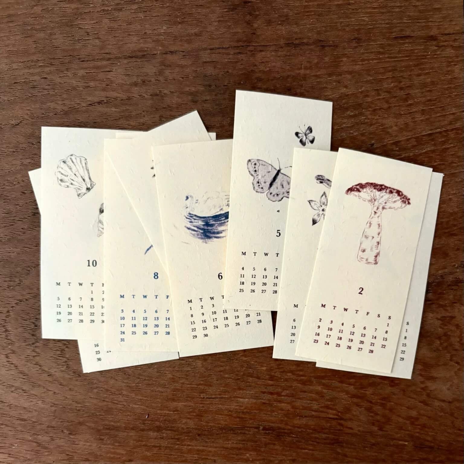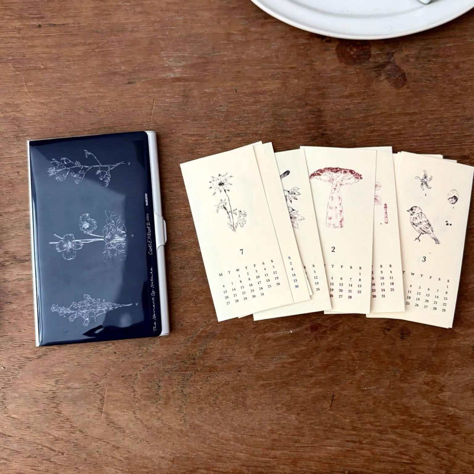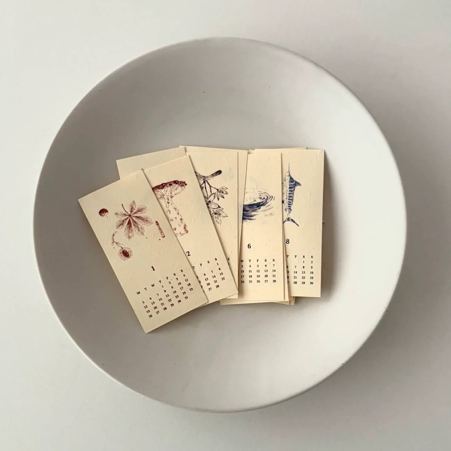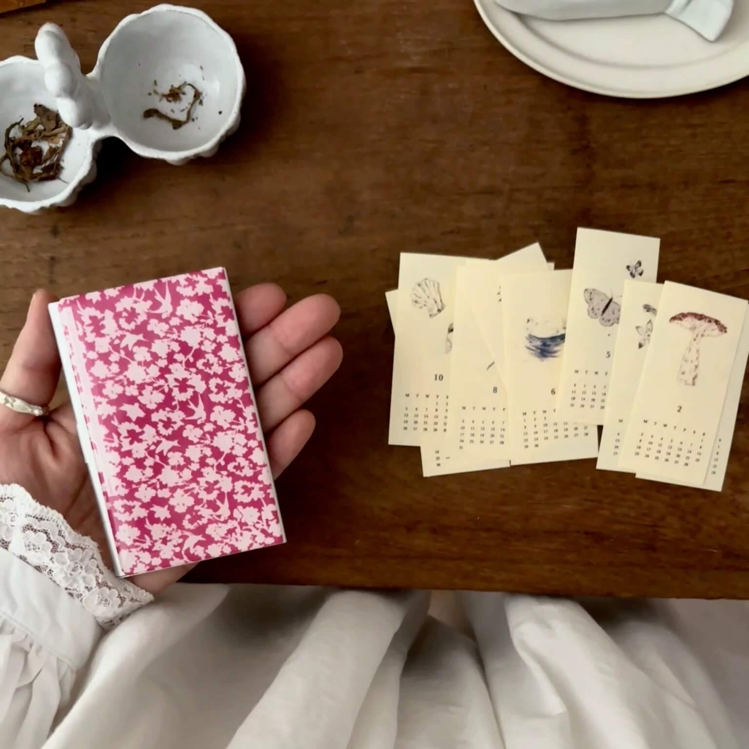 This 12-month mini calendar features delicate pencil-style illustrations in calming blue and green tones, paired with timeless typography. The vintage-inspired artwork and tea-coloured paper bring a gentle warmth, making each page feel like a small keepsake.