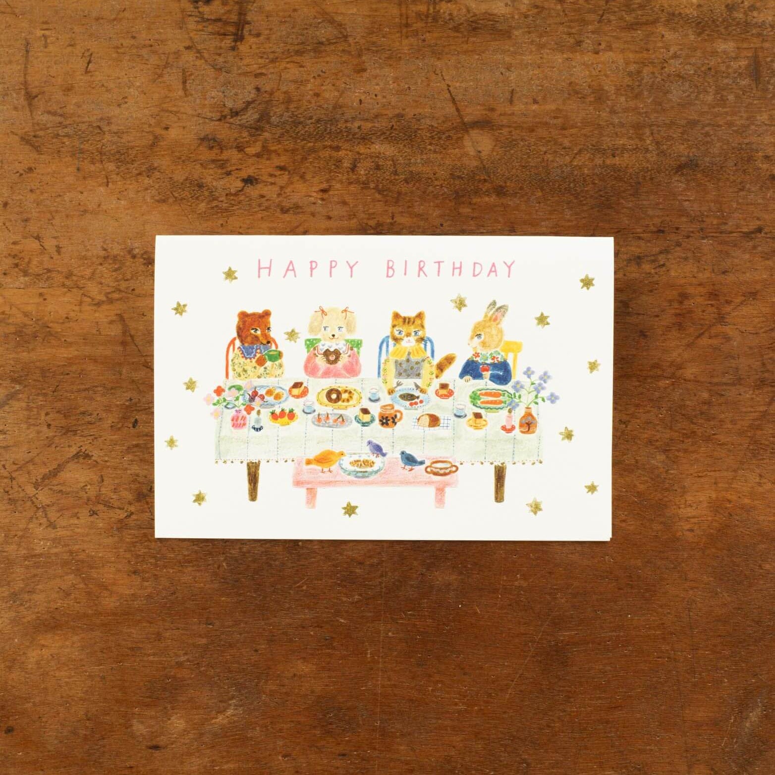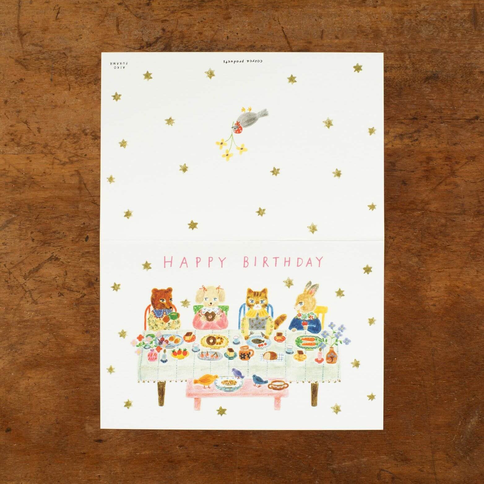 This delicate and serene birthday card showcases the lively party scene filled with cheerful energy, captures the spirit of celebration in every detail. The card is finished with elegant embossed detailing and comes paired with a shimmering silver-foil stamped envelope.