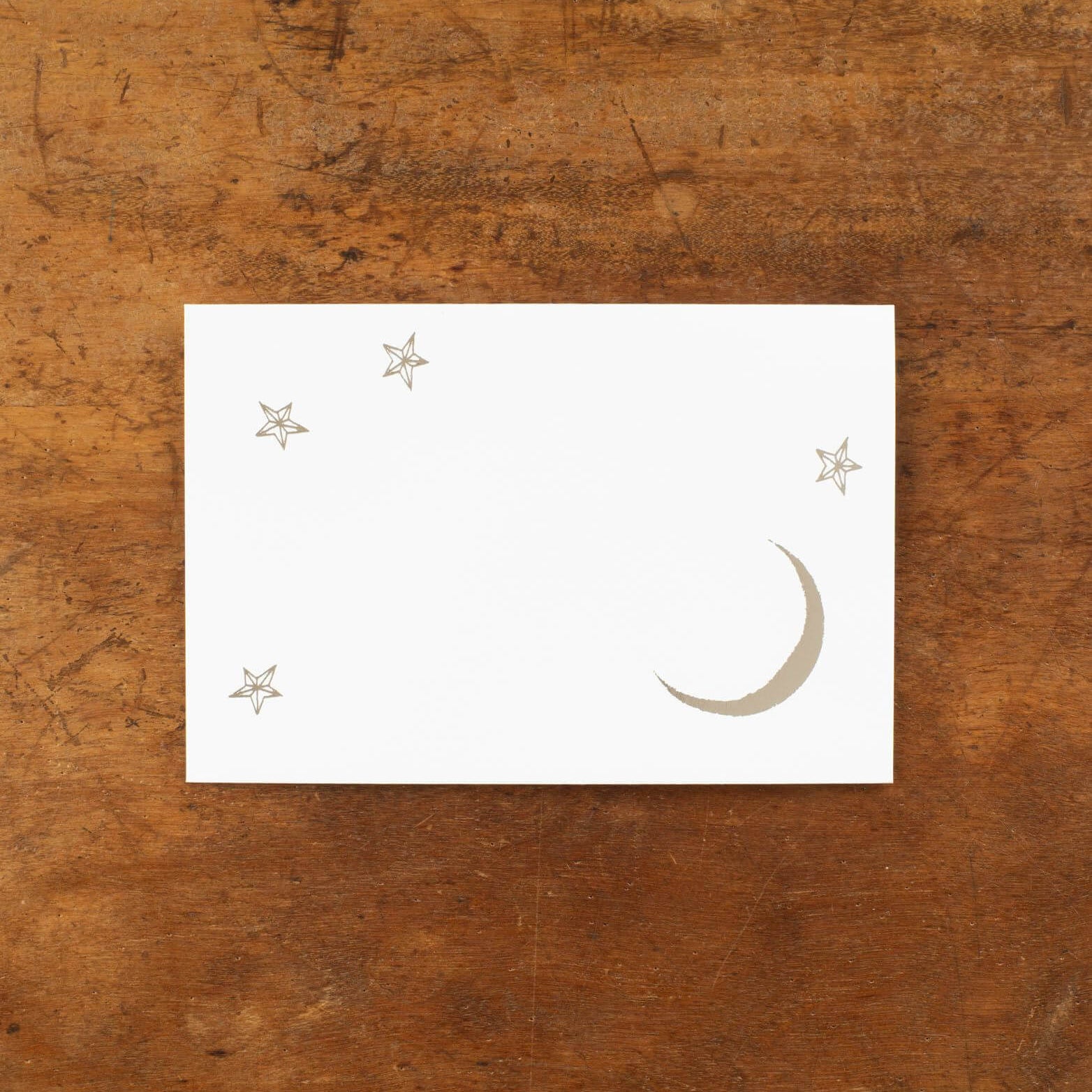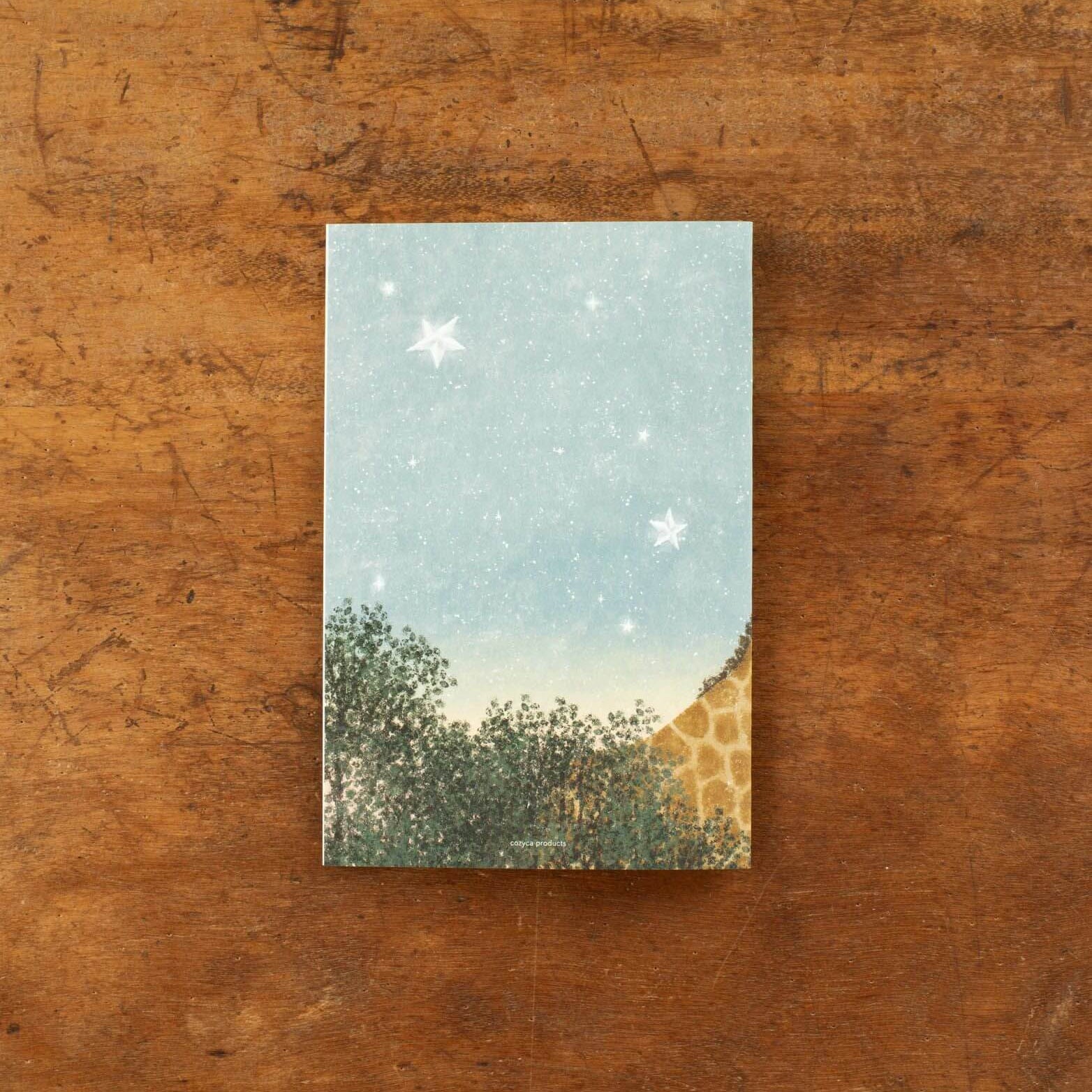 This serene birthday card depicts a tender, dreamlike scene, with a gentle giraffe presenting a stardust gift to a character resting on the crescent moon. Accented with subtle embossing and paired with a silver-foil stamped envelope, it brings a quiet sense of wonder and warmth to any message.