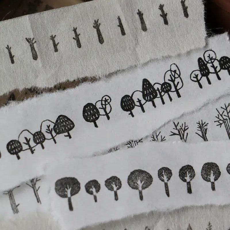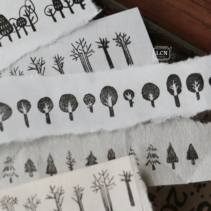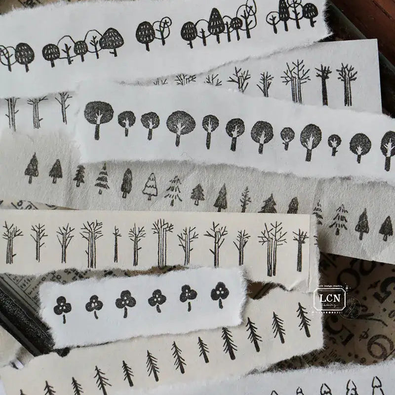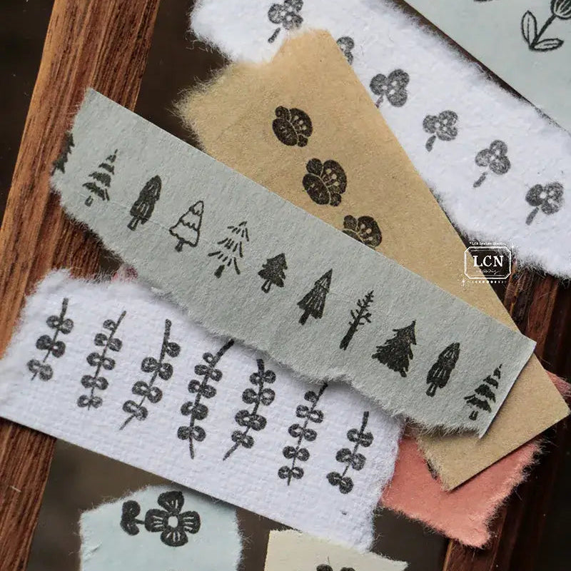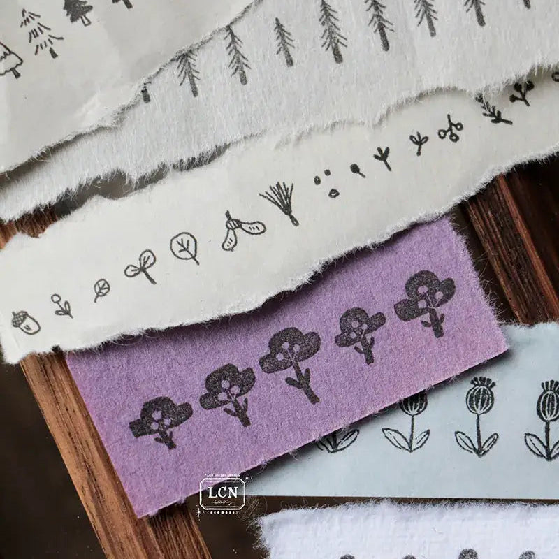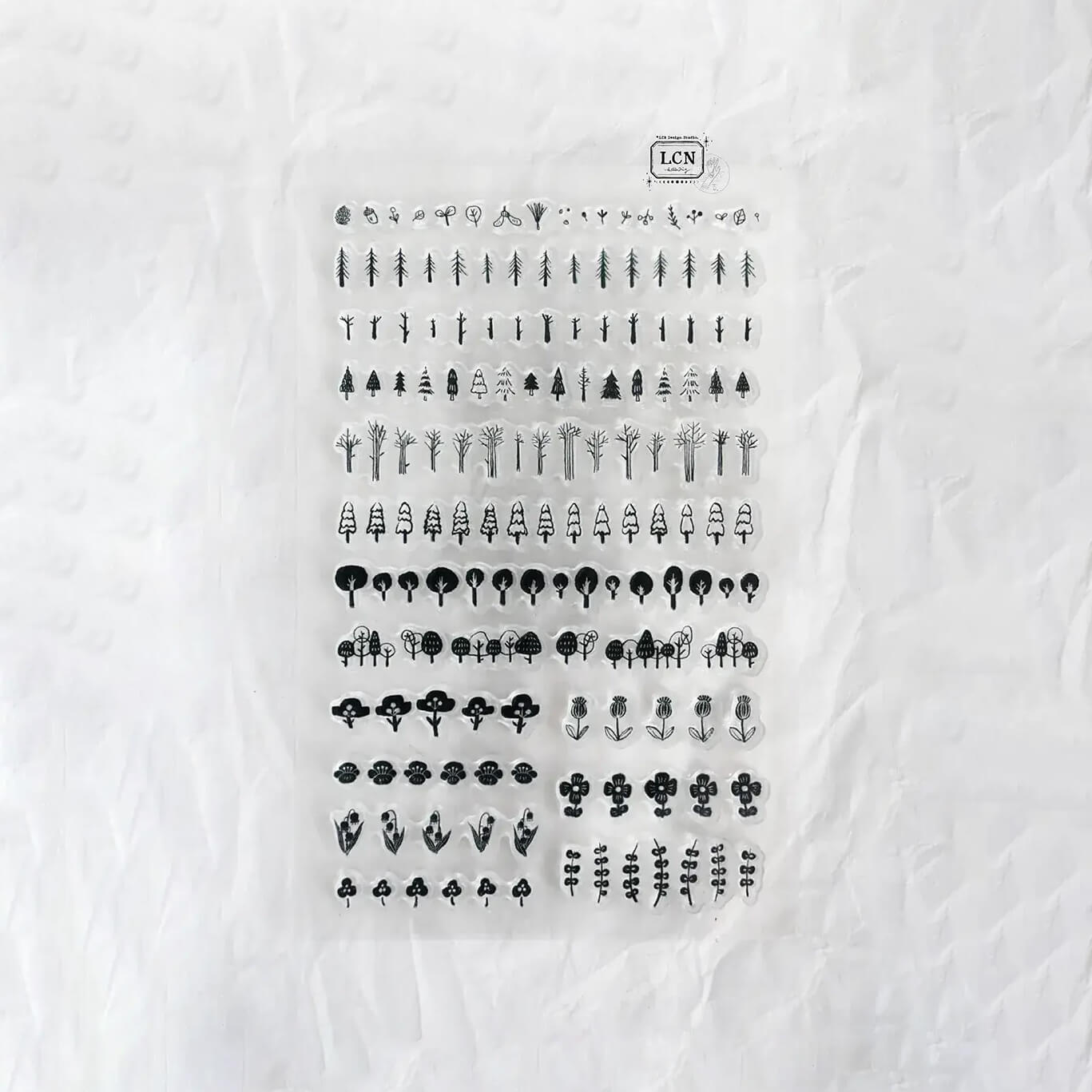 This clear stamp set features a collection of hand-drawn trees, leaves, and floral elements by Lin Chia Ning, arranged in gentle variations of shape, height, and rhythm. From tiny sprigs to rows of trees, each motif feels simple yet expressive, perfect for building quiet scenes or adding subtle structure to your pages.