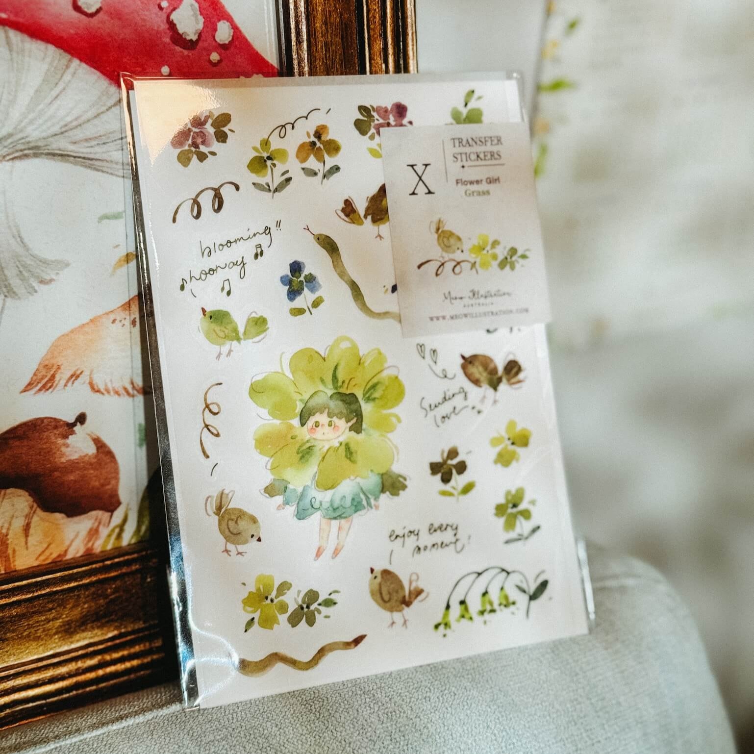 These transfer stickers feature delicate watercolour illustrations by Meow Illustration, bringing soft hues and storytelling details to your journal pages, planners, cards, or gift wrappings.