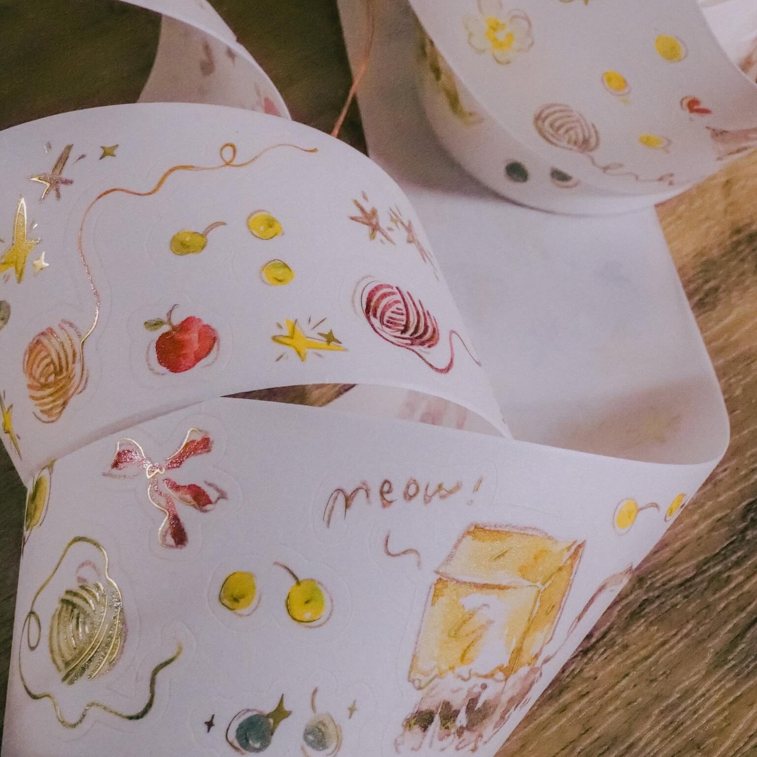 This kiss-cut washi tape features a playful cat beneath a dreamy night sky, surrounded by stars, ribbons, and little charms in matte gold foil.