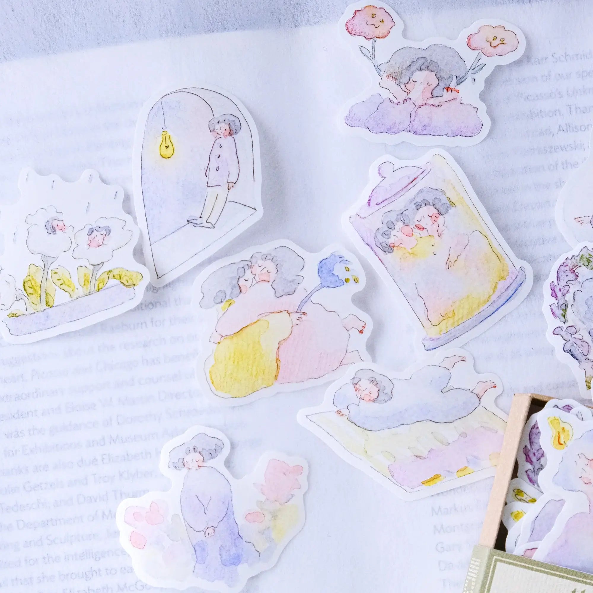 Each little matchbox is a treasure chest of art filled with dodolulu’s whimsical illustrations and a charming selection of sticker flakes.